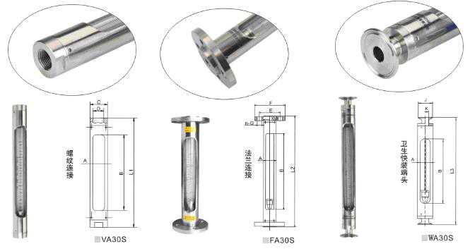 LZB-VA/WA/FA30S系列玻璃轉子流量計為引進型不銹鋼玻璃轉子流量計,其外殼為不銹鋼304材質,接口有內螺紋、活套法蘭、衛生型快裝接頭三種規格連接新形式,產品輕巧美觀適用。