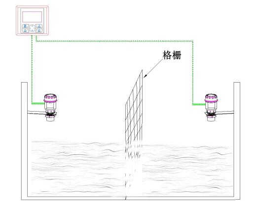 超聲波液位計(傳感器1、2)兩部分組成,傳感器不接觸被測水溶液,儀表顯示液位、液位差及工作狀態。